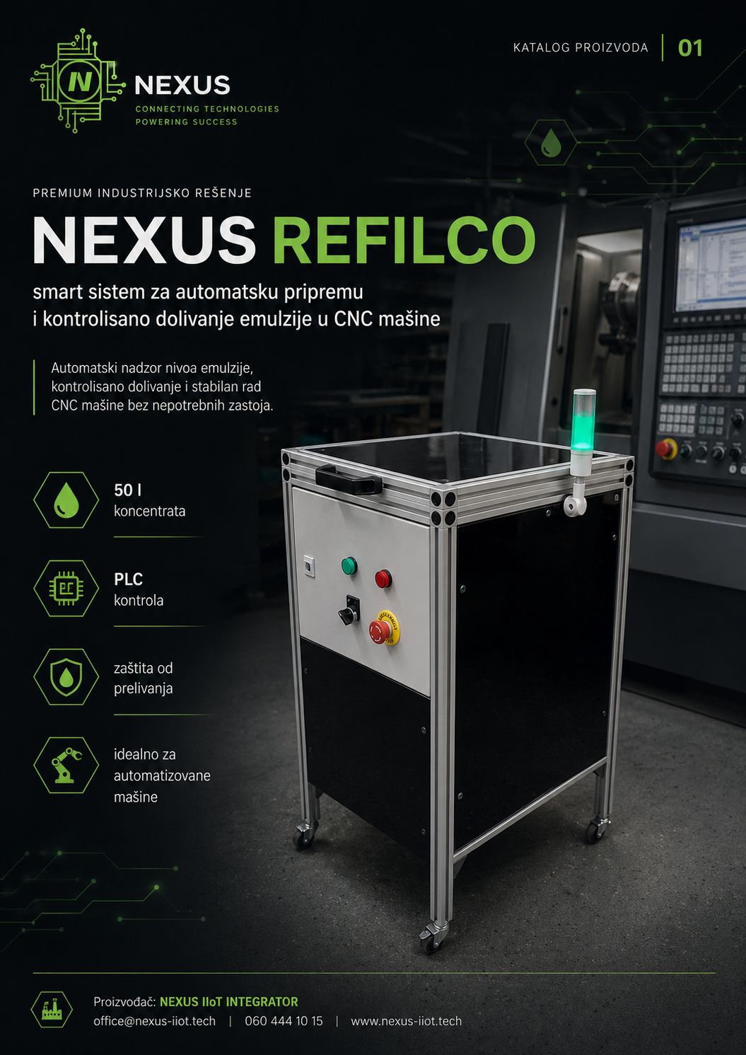 NEXUS REFILCO je pametno rešenje za automatsko dopunjavanje emulzije koje pomaže stabilnijem radu CNC mašina i smanjenju zastoja u proizvodnji.